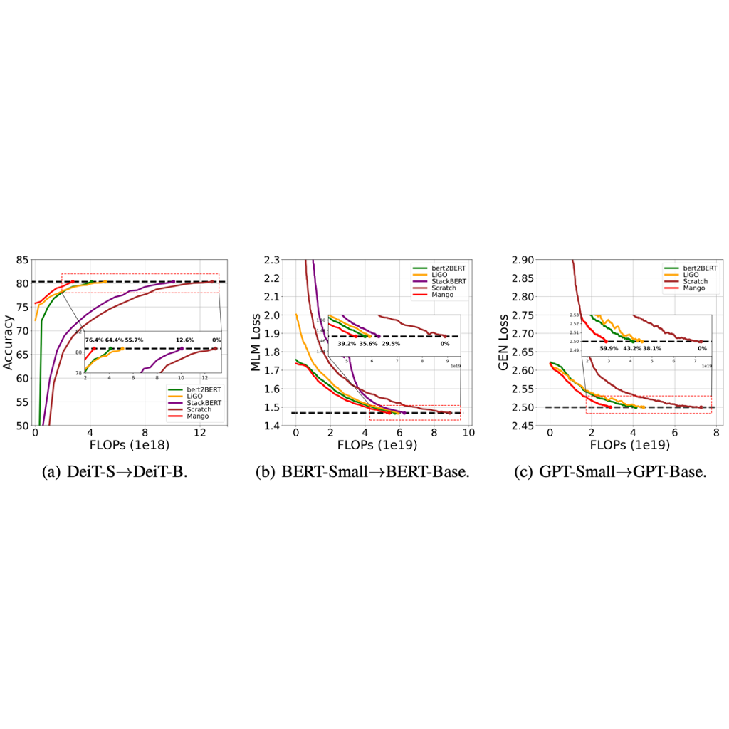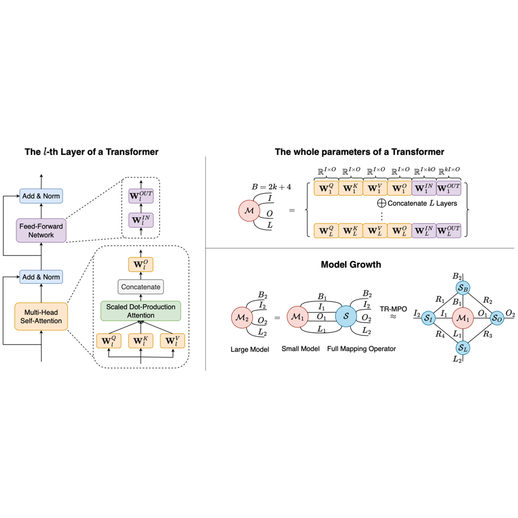 Utilizing tensor ring matrix product operator (TR-MPO) to grow a small pretrained model to a large counterpart for efficient training. |
